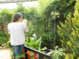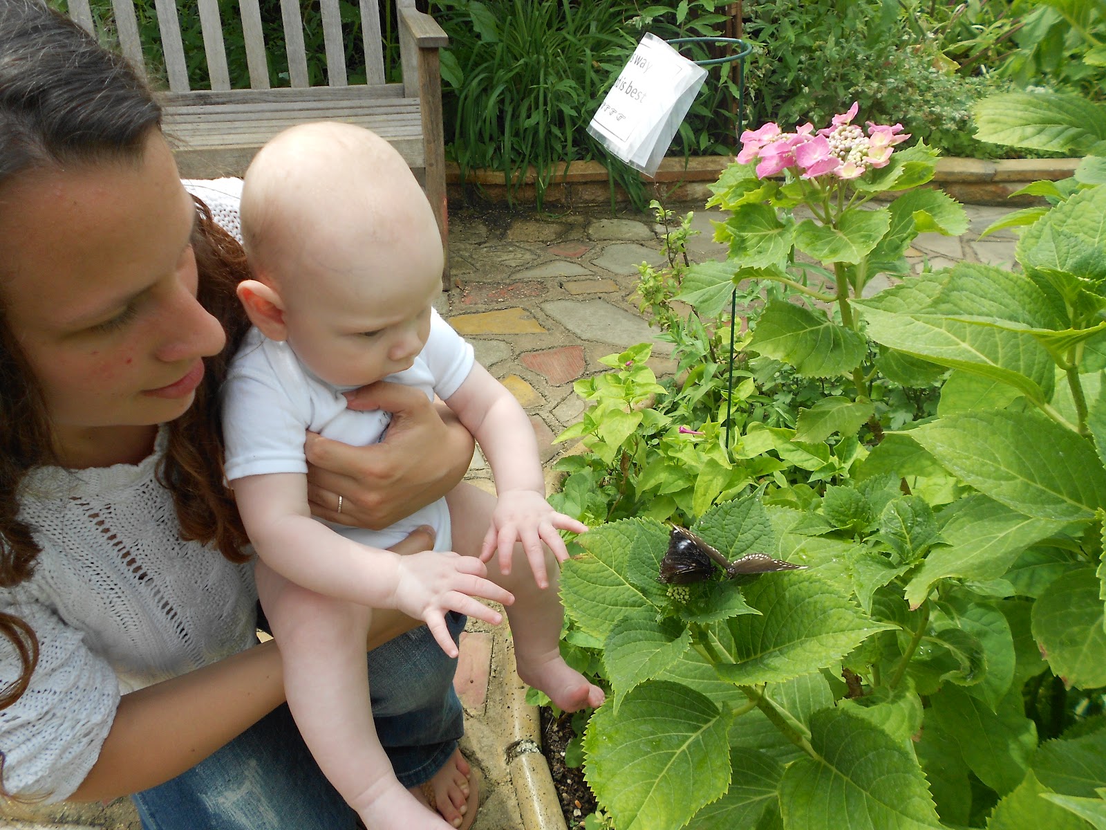 Today we went to Butterfly World with Grandad and Uncle Beau. He slept through the first time we went round, but after we had our lunch we went round again so he could have a look at the Butterflies as he's never seen one before. He loved them, tried to grab a few. He just stared at them in curiosity. He also loved the sound and look of the running water, and also the fishes. He also sat up almost perfectly by himself, I only held onto his wrist.