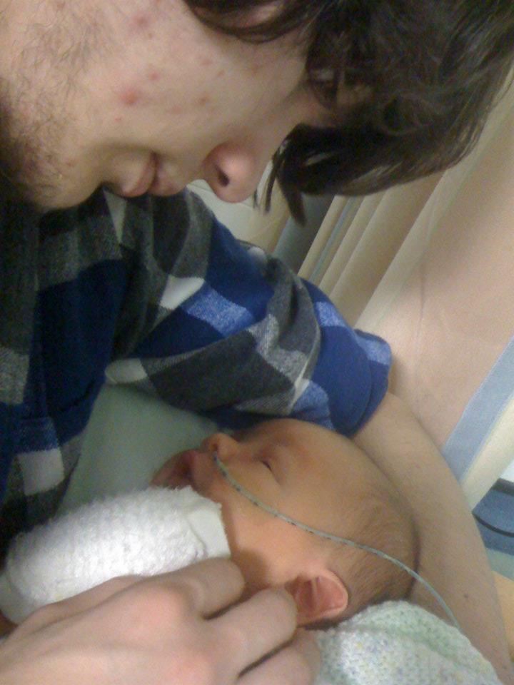 I went into labour at 6am on the 3rd of January and after 4 hours went to the hospital. When they examined me I was already 8cm so I went straight to the labour suit. I was then in labour for another 4 hours. They then had to pop my waters as they wouldn't pop on their own. When they did they found that he had pooed in his waters so they had to monitor his heart beat and my contractions to make sure that he was OK. After roughly an hour of pushing he started to make an appearance but his shoulder got stuck and they were having trouble helping to remove him. Then they saw that the cord was around his neck and he was going blue, so they were desperately trying to get him out quickly. He then appeared and was laid on me and he wasn't breathing, His face was bright blue and his body was completely white. They took him away straight away and resuscitated him, and then brought him in to quickly show Ainslie and I and then quickly whisked him off to NICU.